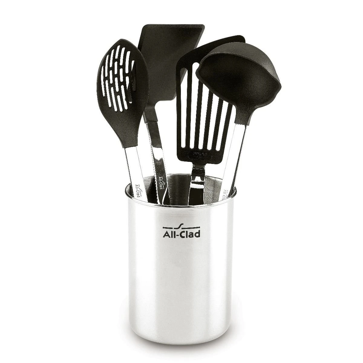 Master everything from a gourmet filet Mignon to a hearty stew with All-Clad’s Nonstick 5pc Utensil Set! All-Clad cook’s tools are crafted to professional standards for a lifetime of use. Each piece is made of heavy-gauge polished 18/10 stainless steel with an ergonomic handle that allows for great functionality and exceptional durability. This set includes a slotted spoon, which is ideal for draining excess sauces or removing boiled vegetables. The ladle features a large 6oz bowl for serving homemade chilies and stews. The solid turner is best for cookies, hamburgers, and weighted items, while the slotted turner is more flexible for light fish fillets or poached foods. Also included with the utensils is a stunning stainless steel canister that will look charming on any countertop.
