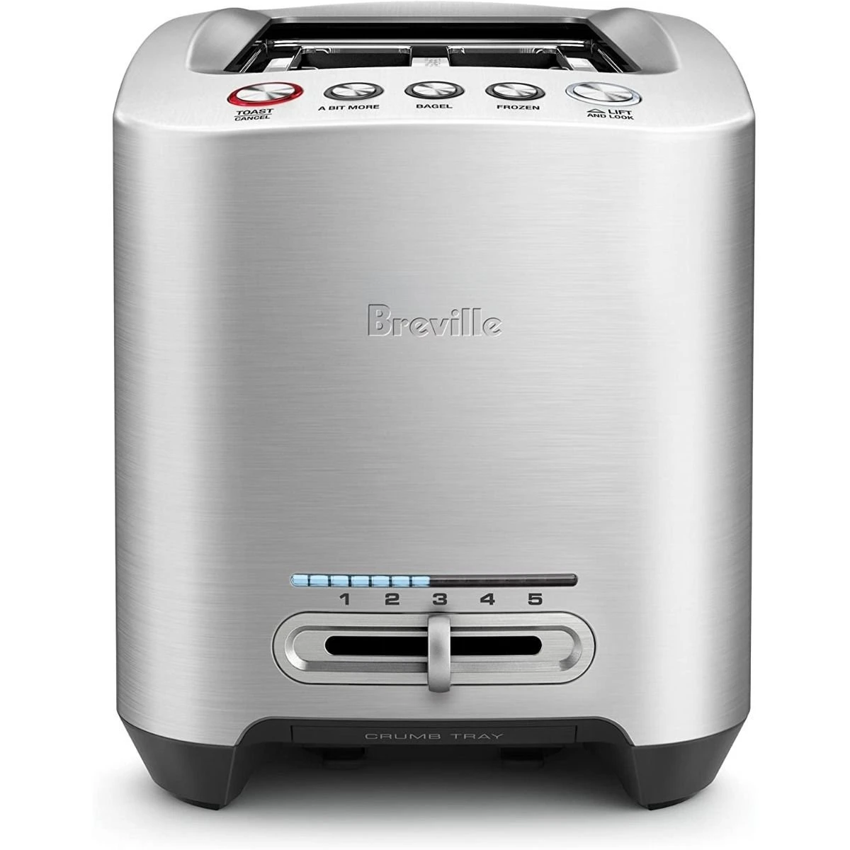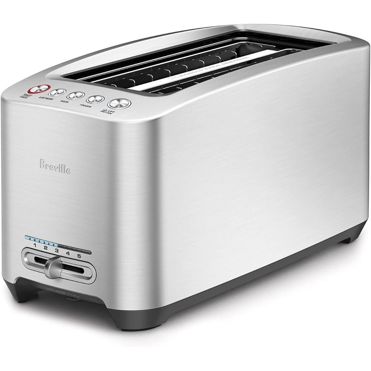 Make the perfect toast every time with the Die Cast Smart Long Slot Toaster from Breville! Featuring a sturdy die-cast steel construction and sleek modern appearance, this toaster can toast up to four slices at a time with dual extra-long slots that save on counterspace compared to bulky four-slot toasters. The LED indicator shows when your toasting cycle is almost complete, and five settings with easy-to-read buttons allow you unprecedented control and ease of use: Toast/Cancel to start and stop toasting, A Bit More to add extra time, Bagel and Frozen features for appropriately even heating and the extremely handly Lift and Look function that raises and lowers your bread to check brownness without interrupting the toasting cycle. The crumb tray is easy to remove and clean, and the rest of the toaster can be wiped down with a sponge or cloth. Whether you’re enjoying a rushed breakfast of toast on your way to work in the morning or a delicious everything bagel with cream cheese as a snack, the Smart Long Slot Toaster from Breville is the answer for perfect toast every time!