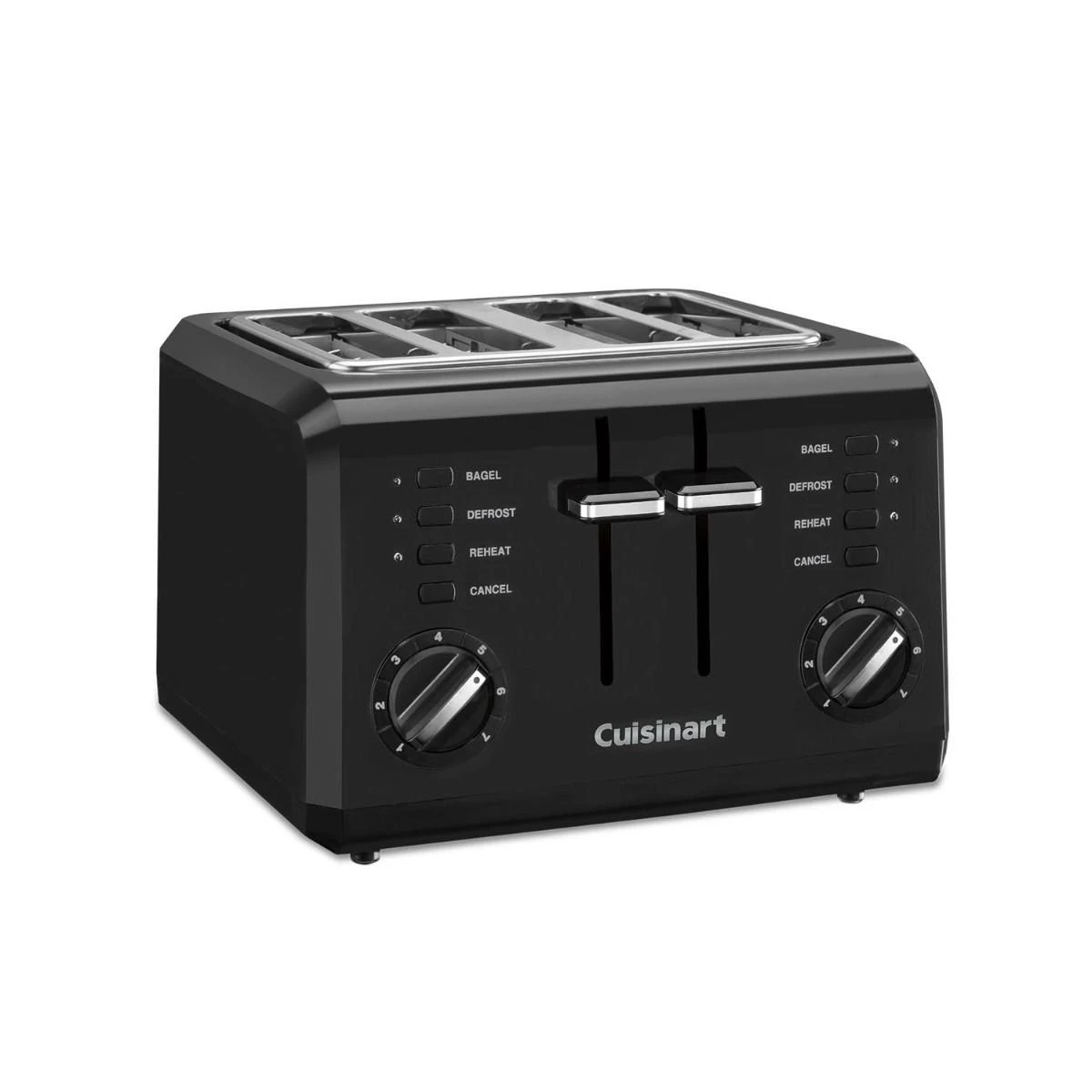The Cuisinart Classic Toaster had room for improvement, so Cuisinart introduces the 4-Slice Compact Toaster in Black. Made from plastic and stainless steel, the toaster’s high-lift carriage works whether facing sideways or facing forward to fit anywhere in your kitchen. The generous slots accommodate up to two thick bagel halves and two slices of bread at once, toasted to your satisfaction with dual custom controls with seven different shade settings.