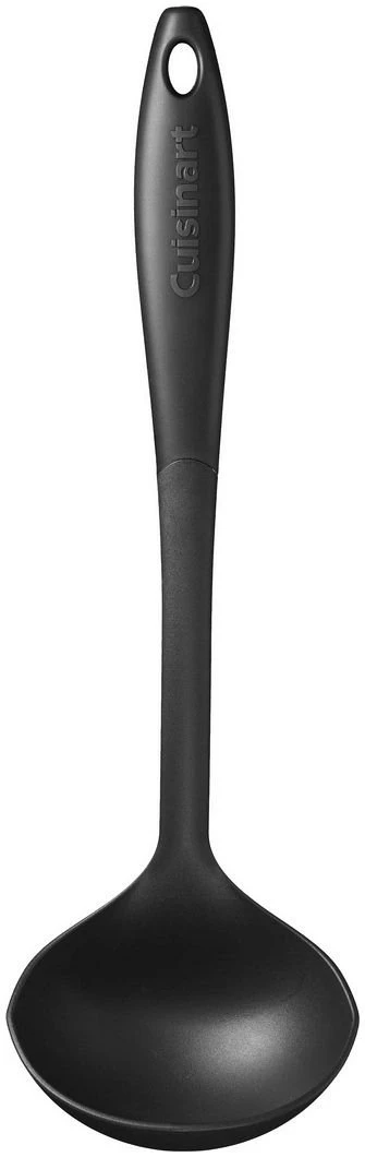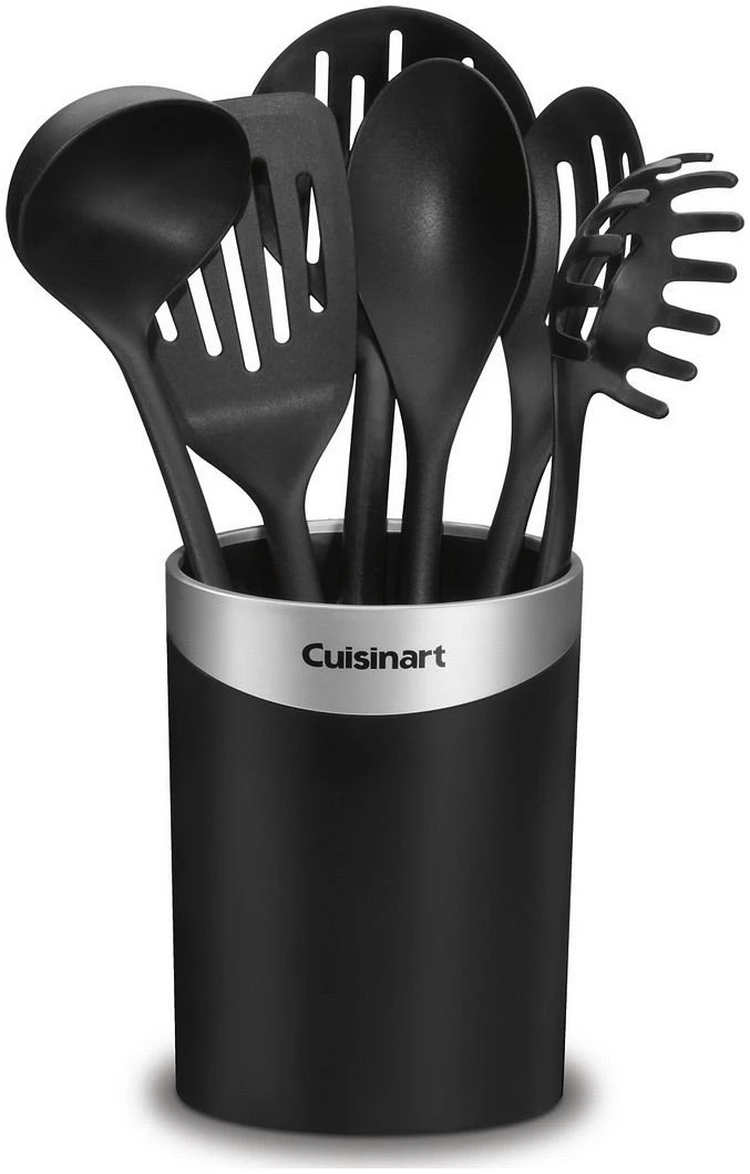 Keep all your kitchen tools in easy reach with this Cuisinart cooking tool set! This 7 piece cooking tool set comes equipped with soft grip nonslip handles, making these tools comfortable to use while decreasing drops and spills. All of these tools are safe to 400° and can easily be cleaned in the dishwasher. This set of Curve line cooking tools comes with the one each of the following pieces: spatula, solid basting spoon, skimmer, slotted spoon, soup ladle, pasta server and storage crock. Cuisinart guarantees this set with a lifetime warranty against factory defect.
