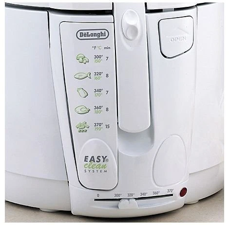 De’Longhi Deep Fryer adjustable thermostat with indicator light handy control allows you to set frying temperature from 300 to 370°, giving you the flexibility to fry foods just the way you like them.