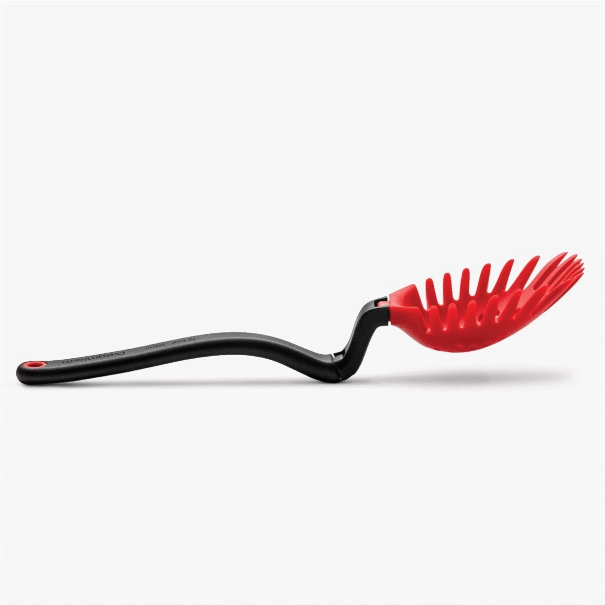 Two heads are better than one, and the Dreamfarm Holey Spadle Slotted Spoon/Ladle in Red is no exception! Made in true Dreamfarm fashion, this gadget takes on the jobs of two everyday kitchen tools by easily transforming from a slotted spoon to a straining ladle and pasta server with a simple twist of the joints. The unique multi-use straining head is designed with small holes that make scooping foods like peas and corn easy, and the prongs make it perfect for serving spaghetti and other kinds of pasta. Made from heat-resistant nylon, this tool is also great for shallow frying or draining meat when transferring out of the pan. The handle’s hygienic design removes the need for a spoon rest by raising the spoon head off your counter, which keeps germs off your spoon and food off your counter. Don’t worry about scrubbing saucy residue from this tool while cleaning up from dinner – the Holey Spadle is dishwasher safe, and a half-turn of the joints exposes them for thorough cleaning. Get the best of two of your most reached-for kitchen tools in one with Dreamfarm’s Holey Spadle Slotted Spool/Ladle in Red!