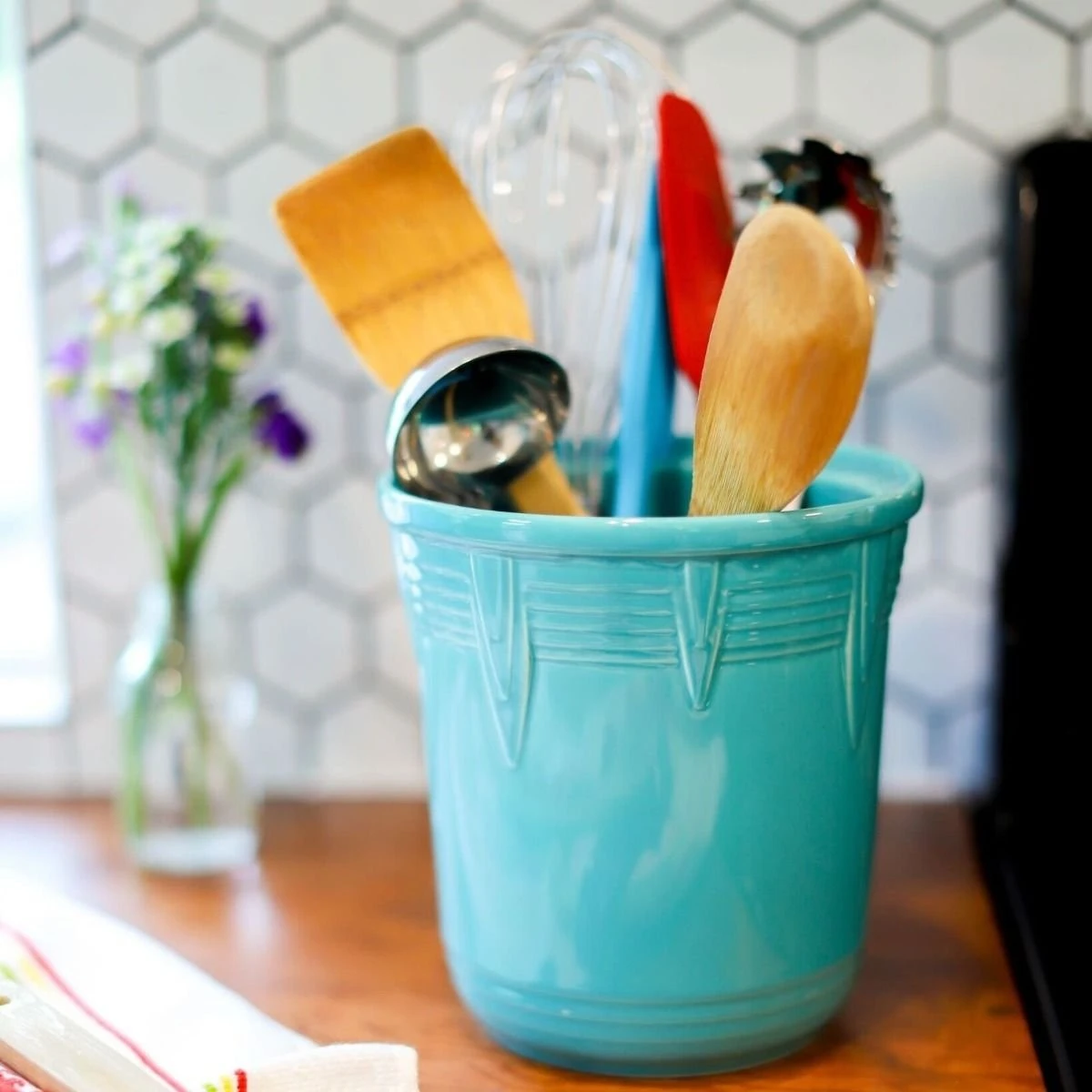 Keep your countertop organized while maintaining your mid-century modern aesthetic with the Fiesta® 2 Qt. Chevron Utensil Crock in Turquoise! Made of fully-vitrified china and lead-free, this durable utensil holder is the perfect way to store your kitchen spoons, spatulas, and ladles. The Chevron Utensil Crocks feature Fiesta’s® classic Art Deco inspiration, with three-dimensional chevrons & rings detailing around the entire perimeter. The signature Fiesta® rings trail to the base which narrows, creating an elegant footed effect. Glazed in Fiesta’s® vibrant Turquoise, this crock will add a tranquil touch to your kitchen. Boasting a 2 Qt. capacity and dishwasher-safe, this utensil holder is a perfect countertop solution to hold all of your most used kitchen tools. For a stylishly forward yet practical addition to your countertop, use the Fiesta® 2 Qt. Chevron Utensil Crock!