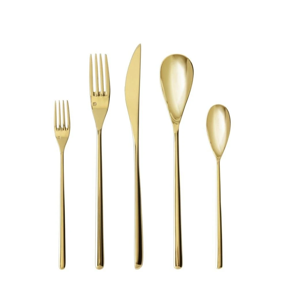 Make a statement with the Fortessa Dragonfly 5pc Place Setting in Gold! This stunning flatware set features a unique slender design and mirrored gold finish that draws the eye. Two droplet-shaped spoons, two sleek forks, and a delicately-sloped knife make up this set, all with elongated round handles. These sophisticated pieces have the perfect amount of heft and balance, making them feel high-quality and comfortable to use. Made from 18/10 stainless steel, this flatware set is dishwasher-safe. Whether you’re hosting a party, setting up a dinner date, or serving yourself, add functional beauty to the table with the Fortessa Dragonfly 5pc Place Setting in Gold!