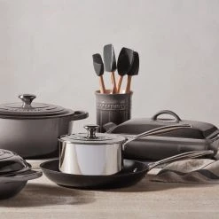 Salt and pepper your dishes to taste with this beautiful Le Creuset 2pc Salt & Pepper Shaker Set in Oyster Grey. Perfect for entertaining, these stoneware Le Creuset salt and pepper shakers have a retro shape with “Le Creuset” engraved on the bottom for a beautiful presentation.