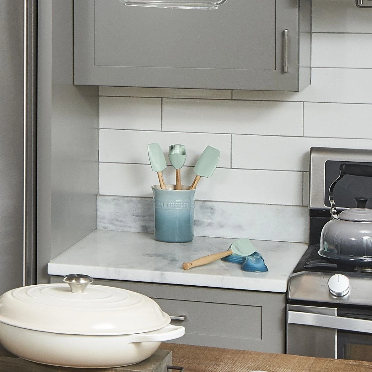 From creamy dips to savory sauces this Le Creuset Craft Series 5pc Kitchen Utensil Set with Crock in Sea Salt will stir, scoop, spread or scrape with ease! The flexible silicone tip scrapes the bowl clean and will not scratch cookware – even non-stick cookware! The easy-to-clean removable silicone heads are dishwasher-safe for easy cleanup and to better preserve the wooden handles. The smooth wooden handles provide a comfortable, slip-free hold with grip rings for added control. Detailed in Le Creuset’s striking yet subtle Sea Salt blue, this utensil set makes waves in your kitchen by complementing other pieces from the Sea Salt collection, or stands out against mixed shades.