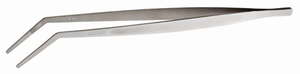 Whether your plating style is meticulously-designed or natural and “effortlessly” beautiful, Mercer Culinary has you covered with their plating tools! For plating any kind of small or delicate food precisely where you want it, reach for a pair of Curved Tip Precision Plating Tongs. Designed with less tension to provide greater control with more delicate foods, these tongs are made of 18/8 stainless steel that has been heat-treated for greater spring back so they’ll keep their shape use after use. The inside of the tongs is serrated for a better grip on food, while raised grips on the outside keep them stable in your hand, even with gloves on. These 11.75” curved tip tongs are bent at a 40° angle so it’s easier to see exact placement. Use them to place berries on top of a decadent dessert, to precisely lay thin slices of beet or another vegetable to form a pattern, or to gently place ingredients on top of a design you made with a plating wedge.
