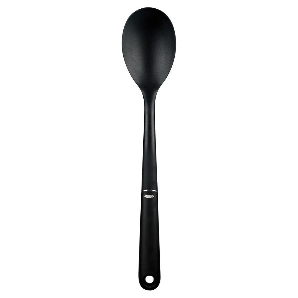 The smells that come from the kitchen should be of sizzling bacon or a simmering mushroom beef stew and not burning utensils; be confident of your tools with an OXO Good Grips nylon spoon. The OXO’s nylon construction will give you a worry free experience stirring soups, stews or sauces. The nylon is heat resistant up to 400 F is accented with stainless steel for a more contemporary look. Leave the burning risk at the door and choose a solid OXO nylon spoon for your kitchen.