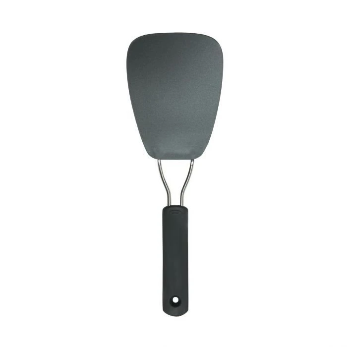 Pancakes in need of flipping and eggs being fried are no match for Large Flexible Nylon Turner in chic Black by OXO! This sizable turner measures 13” x 4” x 4”, so you’ll find removing heavy, unwieldy slices easy to manage. OXO made this versatile turner heat resistant to 400 degrees using dishwasher safe silicone. With a stainless steel base giving strength to this large turner coupled with the flexibility of silicone so you’ll find fitting this turner into baking dishes easier than with a hard turner. Designed with comfort in mind the flexible turner has a soft non-slip grip and is a perfect companion for your non-stick cookware. Use this substantial turner for all of your favorite recipes, you’ll toss out your old turners for good!