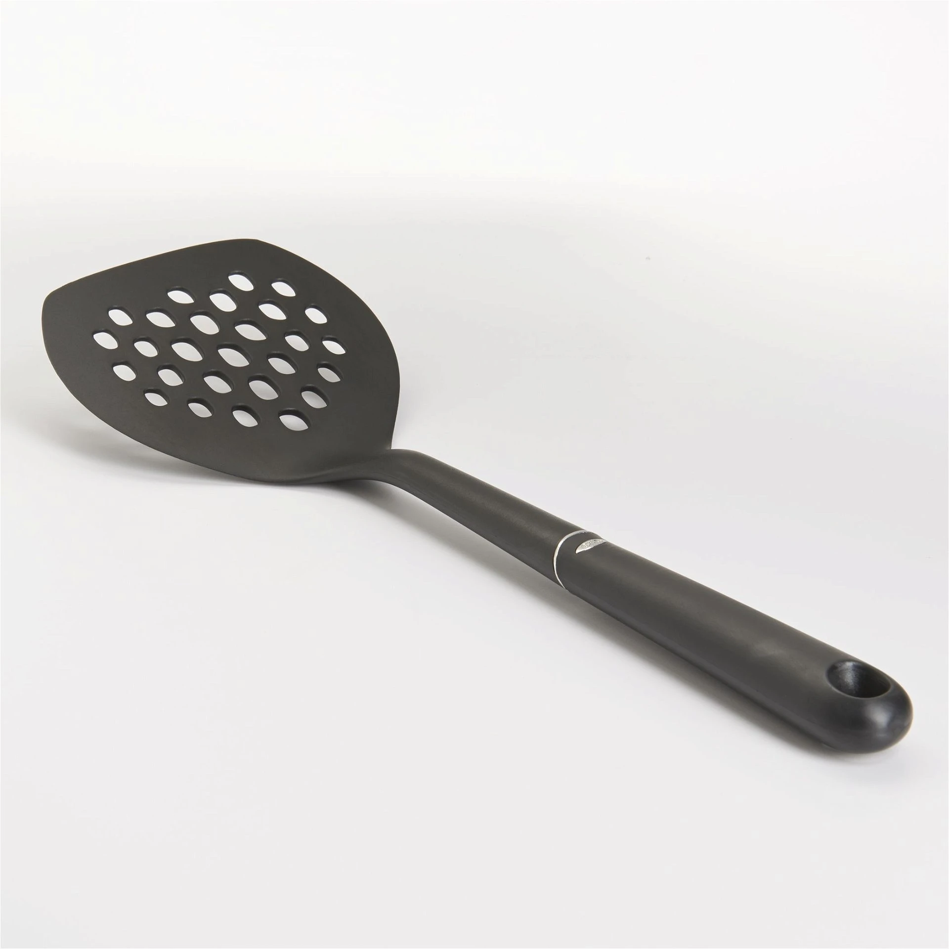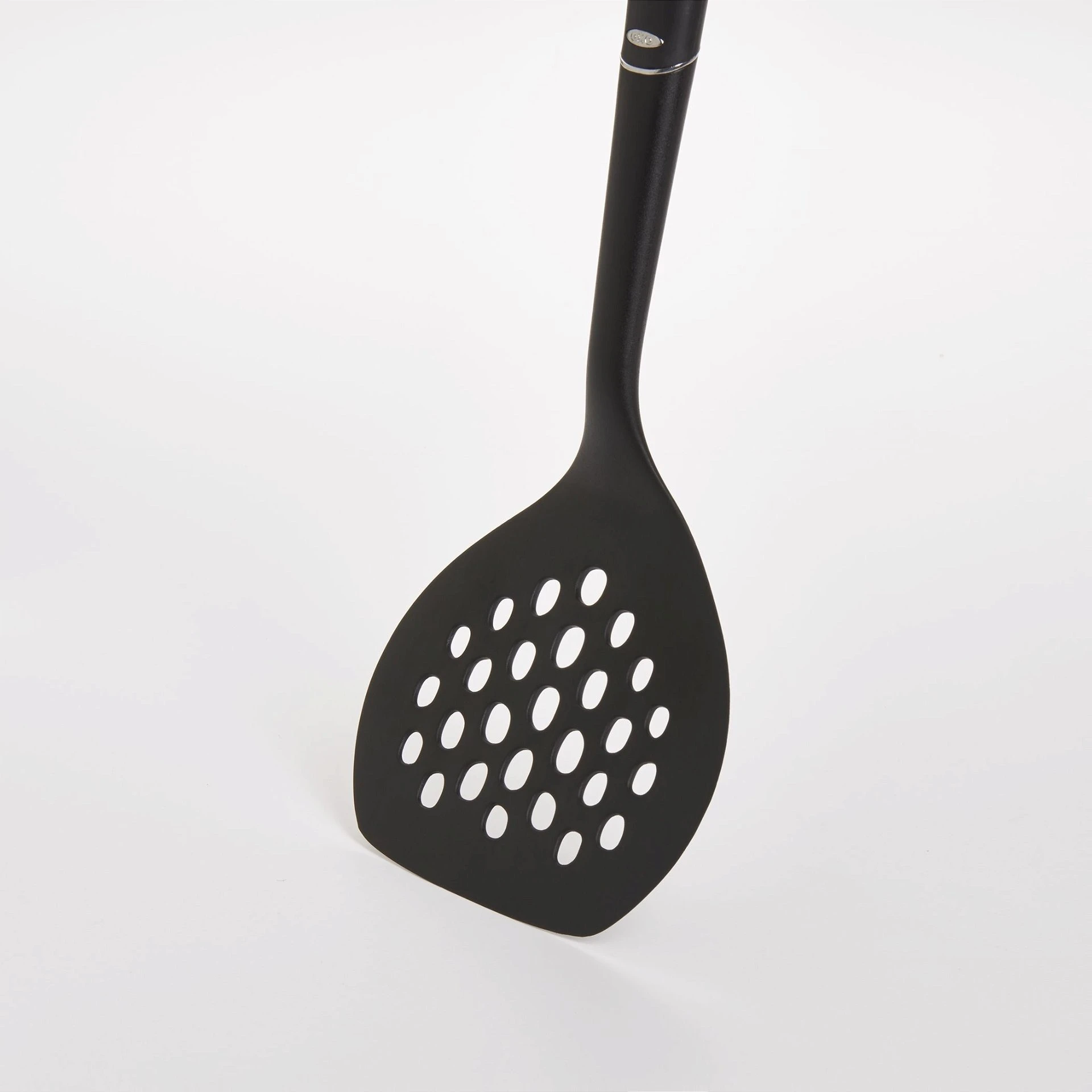 Cook professional-looking burgers and pancakes with ease using the OXO Nylon Round Turner. This turner features an extra long, no-slip handle and wide head so you can confidently turn anything from fish to eggs, or gently slip hot cookies off the baking sheet, all with the same, easy-to-use turner. Made from heat safe nylon, the OXO Round turner won’t scratch non-stick cookware, making it an easy addition no matter what sort of pots and pans you already own. Add the OXO Nylon Round Turner to your kitchen arsenal today and cook your next meal with ease!