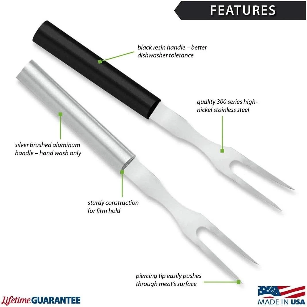Prepare and serve up the main course for holidays or Sunday dinner with the Carving Fork from Rada Cutlery. The long tines are constructed from 300 series high nickel stainless steel for durability and are extra sharp to easily pierce the surface of meats. With a sleek, brushed silver satin handle, this carving fork is as aesthetically pleasing as it is functional. This utensil makes carving up a Thanksgiving turkey, turning steaks on the grill and serving up thick, savory slices of ham a breeze, so don’t hesitate to order your own Rada Cutlery Carving Fork today!
