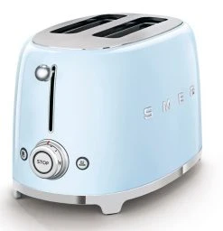 Reminisce about days with leather jackets and slick-back hair! While you do, enjoy a timeless classic designed to brown toast and other breads for a quick meal or snack: the 50βs Retro 2-Slice Toaster by SMEG. Take notice of the smooth, durable steel body and polished chrome base β a long-lasting, attractive appeal from your counter. A style inspired by the 50s, the pastel blue toaster combines a groovy look with modern functionality for a piece of hardware you can rely on to consistently brown, reheat, or defrost toast, bagels, and more. Such tasks are a piece of cake with the 6 browning levels, as well as the 3 pre-set programs: reheat, defrost, and bagel. With both of the extra-wide slots, itβs easy to simply slide in your bread. Clean the toaster by simply wiping it down and removing and dumping the crumb tray underneath. Some ages are never truly out of style, so be a part of the revival with the SMEG 50βs Retro 2-Slice Toaster.